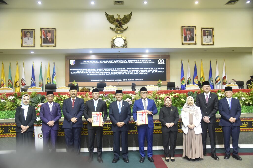 Ketua DPRD Provinsi Lampung, Bapak Ahmad Giri Akbar, SE., MBA. memimpin jalannya Rapat Paripurna Istimewa DRPD Provinsi Lampung dalam rangka Penyerahan Laporan Hasil Pemeriksaan (LHP) BPK Perwakilan Provinsi Lampung atas Laporan Keuangan Pemerintah Daerah (LKPD) Provinsi Lampung Tahun Anggaran 2024. Bertempat di Ruang Rapat Paripurna DPRD Provinsi Lampung. Jum’at, 23/5/2025.