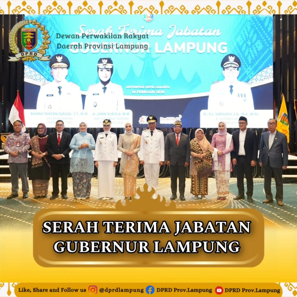 Pimpinan DPRD Provinsi Lampung beserta Anggota DPRD Provinsi Lampung dan Sekretaris DPRD Provinsi Lampung menghadiri Acara Serah Terima Jabatan Gubernur Lampung oleh Pj. Gubernur Lampung Bapak Dr. Drs. Samsudin, S.H., M.H., M.Pd kepada Bapak Rahmat Mirzani Djausal, S.T., M.M. sebagai Gubernur Lampung Periode 2025-2030. Bertempat di Movenpick Hotel Jakarta. Kamis, 20/2/2025.