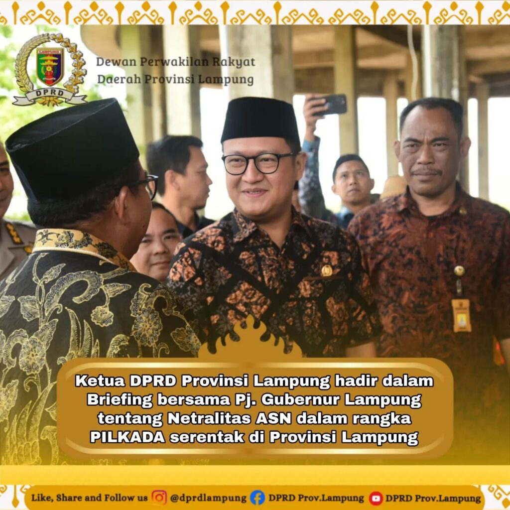 Ketua DPRD Provinsi Lampung, Bapak Ahmad Giri Akbar, SE., M.BA. serta Sekretaris DPRD Provinsi Lampung Ibu Hj. Tina Malinda, S.Sos., MM. menghadiri Acara Briefing bersama Pj. Gubernur Lampung tentang Netralitas ASN dalam PILKADA serentak di Provinsi Lampung tahun 2024 dan dilanjutkan Sholat Jum’at di Masjid Kota Baru, Jum’at (06/09/2024). Turut hadir dalam acara tersebut mantan […]