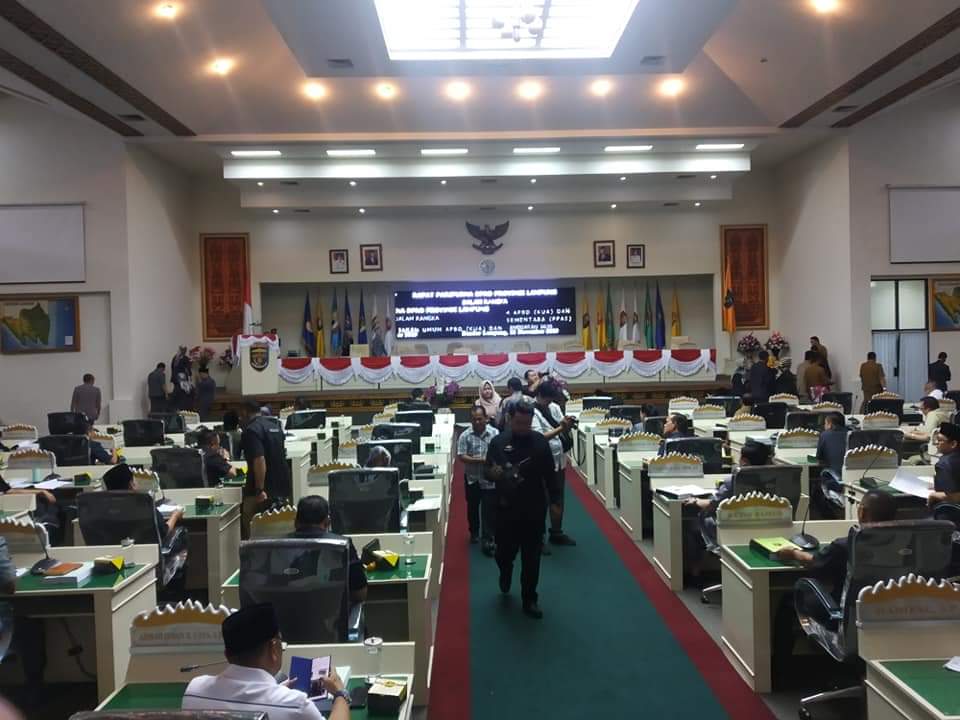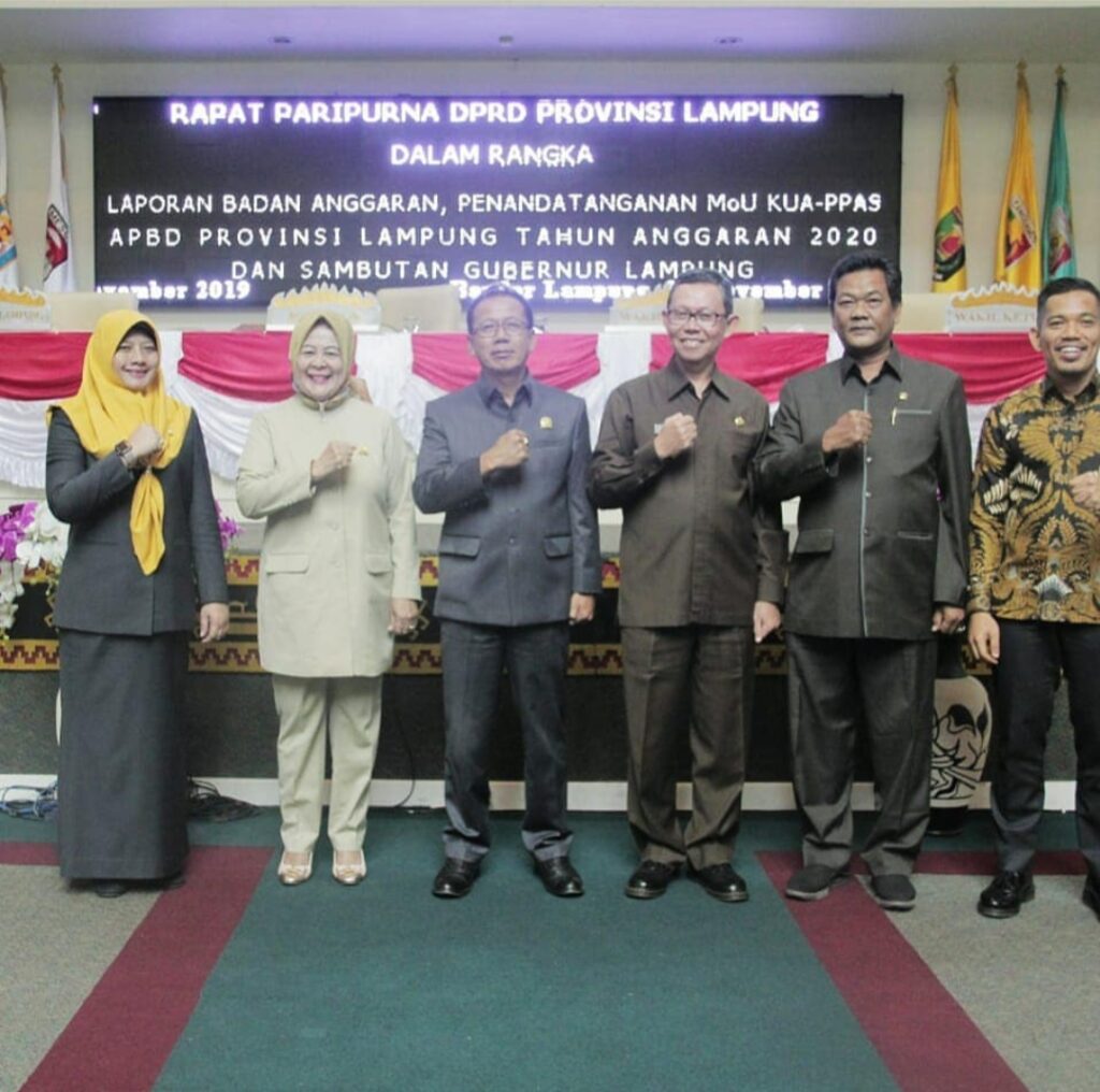DPRD Provinsi Lampung menggelar rapat paripurna dengan agenda Penyampaian Laporan Badan Anggaran, Penandatangan MoU KUA PPAS Anggaran Pendapatan dan Belanja Daerah Provinsi Lampung Tahun Anggaran 2020 serta Sambutan Gubernur Lampung pada hari Jum’at, 15 November 2019.
